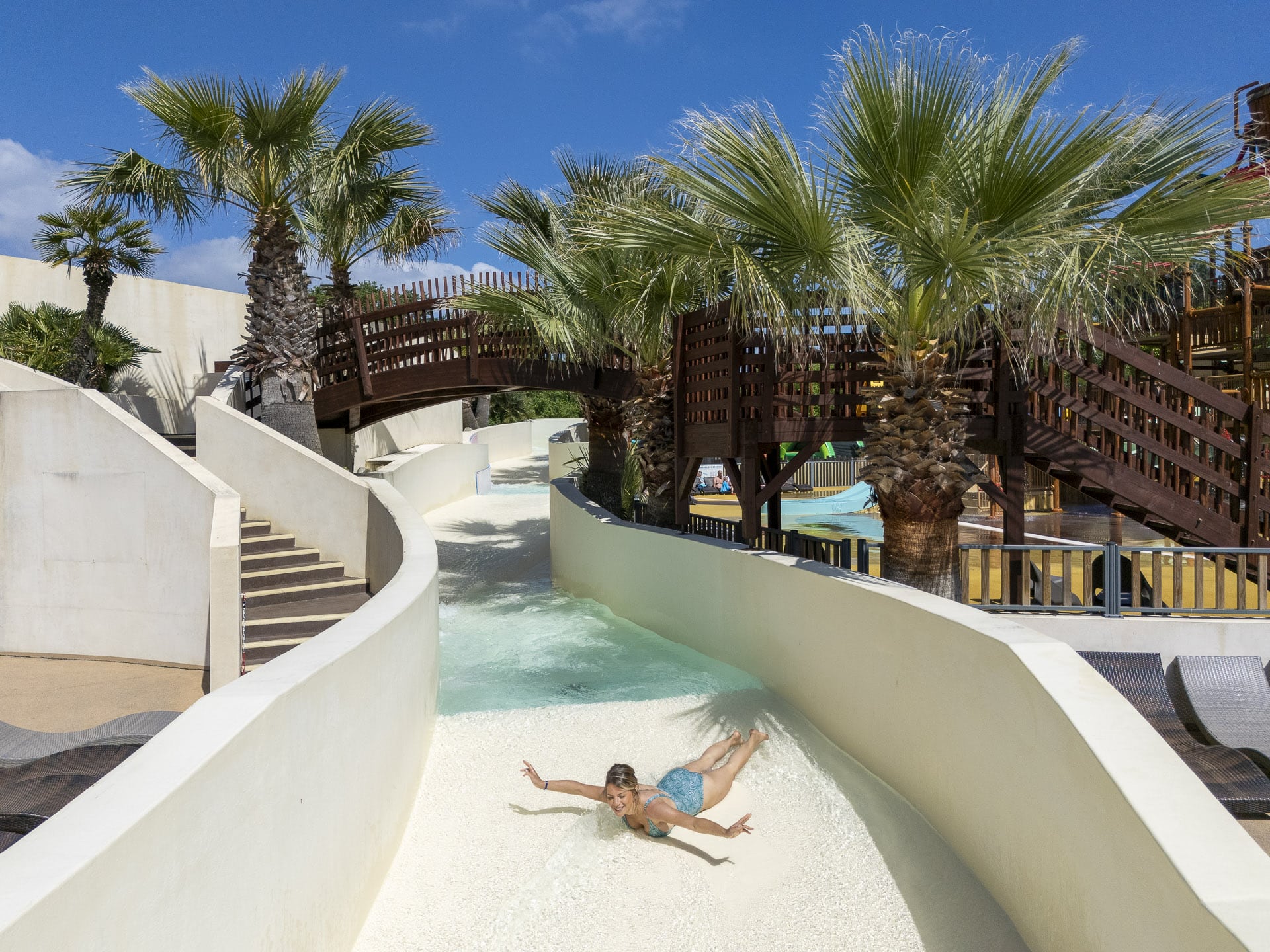 Unser Wasserpark bietet klar abgegrenzte Bereiche, so dass jeder seinen Platz finden und die Aktivitäten genießen kann, die perfekt auf sein Alter und seine Wünsche abgestimmt sind. Während die dynamischen Kinder sich im Wasser, auf den Rutschen oder im Wellenbad austoben können, finden die Faulenzer bequeme Liegestühle am Beckenrand oder auf der Sonnenterrasse, wo Sie sich in der Sonne sonnen können, um Ihre Bräune zu perfektionieren, oder im Schatten eines Sonnenschirms Ihr Lieblingsbuch lesen können. Während Ihres Aufenthalts auf dem Campingplatz mit Wasserpark in Biscarrosse können Sie zwischen Schwimmen und Entspannen wechseln, ganz wie Sie möchten.